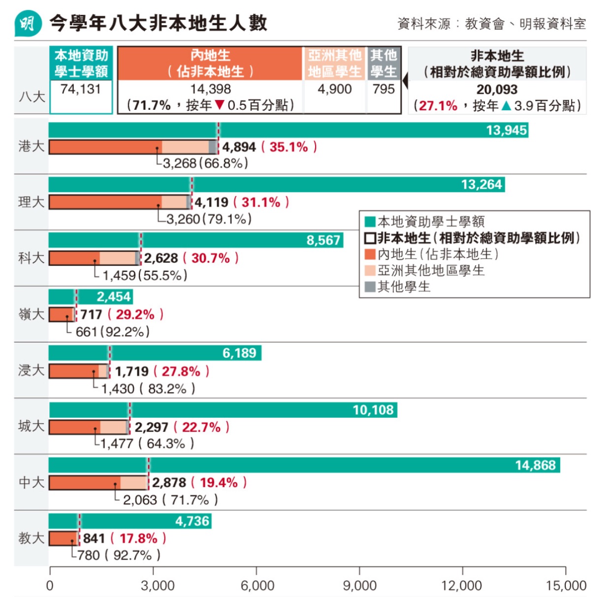 ● 大學教育資助委員會數據顯示,今學年八大非本地本科生總數逾兩萬,較去年增加約2900人。港大以35.1%的非本地生比例領跑八大,理工、科大緊隨其後,分別達31.1%、30.7%;教大雖比例最低為17.8%,但國際生人數同比大幅上漲,生源覆蓋哈薩克、緬甸、馬來西亞等多個國家。