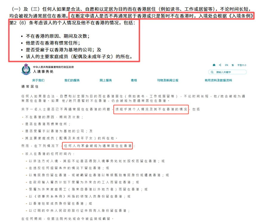 任何人合法、自愿、以定居为目的在香港居住,即便暂时不在港,仍视为「通常居住在香港」。