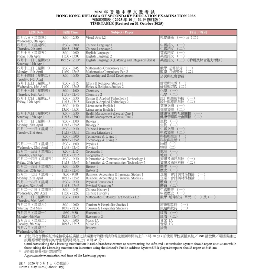2026 年香港中学文凭试(DSE)笔试即将开考!为帮助各位考生平稳应考、规避失误,我们整理了官方时间节点、考场必备清单、核心纪律要求,考前快速查漏,从容上考场!