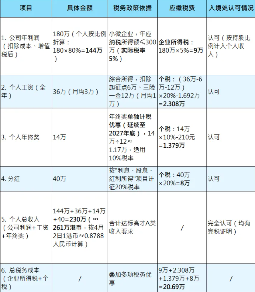 - 个人工资 + 分红 + 持股折算利润 → 合并达标 250 万港币